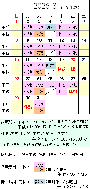 3月19日(木)、27日(金)午後、30日(月)は休診とさせて頂きます。ご迷惑をおかけしますがよろしくお願いいたします(2026.1.31掲載)